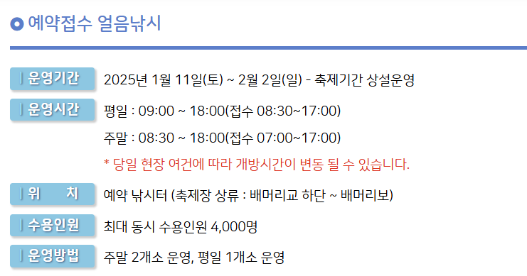 - 얼음낚시나 맨손잡기 체험은 사전 예약이 필요하니 공식 홈페이지를 통해 미리 예약하세요.