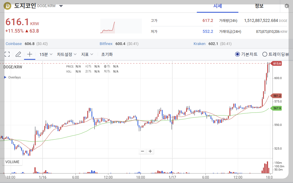 도지코인은 지난 24시간 동안 약 13.10%의 상승률을 기록하며 현재 616원에 거래되고 있습니다. 이는 지난 7일간 23% 이상의 상승률을 보인 것으로, 단기적으로 강한 상승 모멘텀을 유지하고 있음을 알 수 있습니다. 도지코인의 이러한 상승세는 비트코인과 이더리움 등 주요 암호화폐들의 상승과 맥을 같이하고 있습니다. 이로써 최근 제기되었던 1월 도지코인 1달러, 즉 도지코인 1500원 달성 목표가 가시권에 들어오는 것 같습니다.