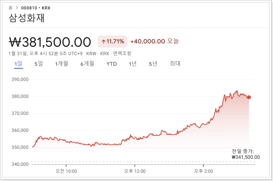 오늘 삼성화재의 주가는 장중 한때 11% 이상 상승하며 38만 원대를 기록했습니다. 이는 최근 하락세를 벗어나며 투자자들의 매수세가 몰린 결과로 분석됩니다. 주가 급등의 주요 원인은 바로 회사가 발표한 중장기 기업가치 제고 계획입니다.